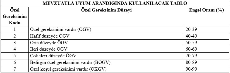 Bunun yerine örneğin raporda Özel Gereksinim Düzeyi başlığı altında engellilik oranlarına esas teşkil etmek üzere ifadeler yer almakta olup burada yer alan özel gereksinim düzeyi buna bağlı olarak engel oranın tespiti için yönetmeliğe ekli ÇOCUKLAR İÇİN ÖZEL GEREKSİNİM RAPORU (ÇÖZGER) MEVZUATLA UYUM ARANDIĞINDA KULLANILACAK TABLO dikkate alınacaktır.